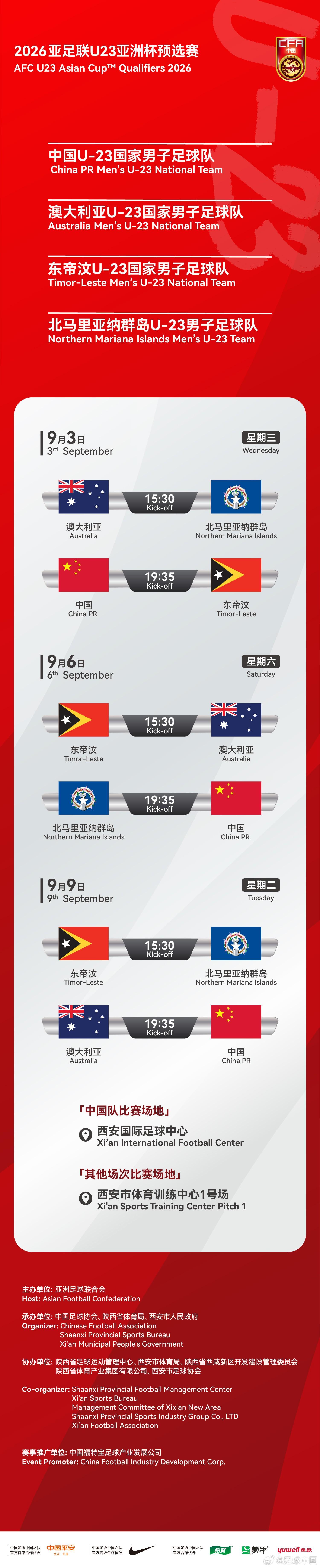 本次赛事,中国队与澳大利亚队、东帝汶队和北马里亚纳群岛队同组,中国队的比赛依旧将在西安国际足球中心举行。