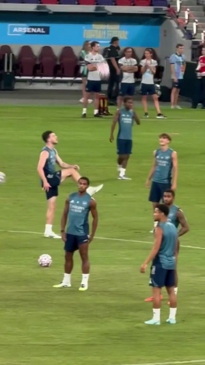 训练中,赖斯向小将道曼展示了一下屁股颠球,随后道曼准备模仿时,阿尔特塔路过伸手打断了道曼的动作。